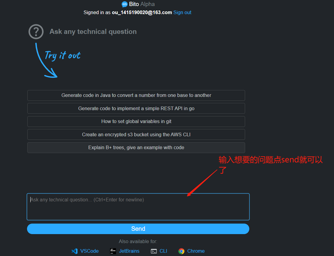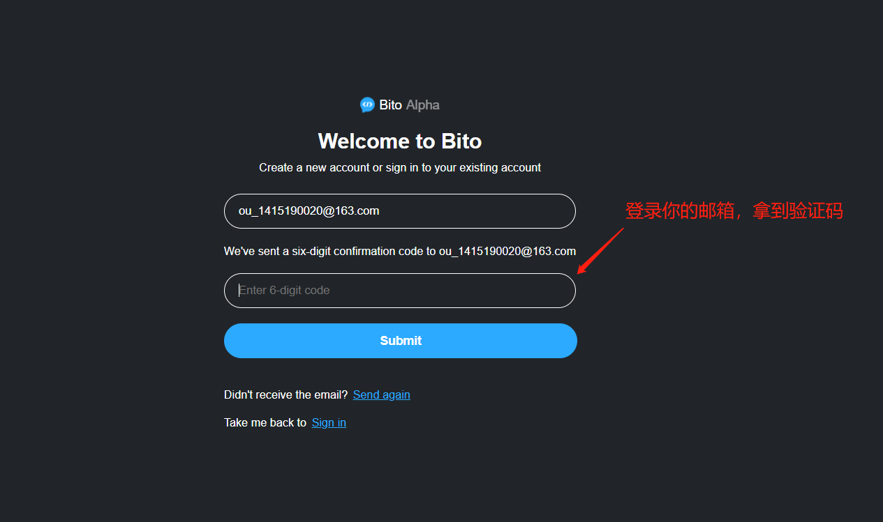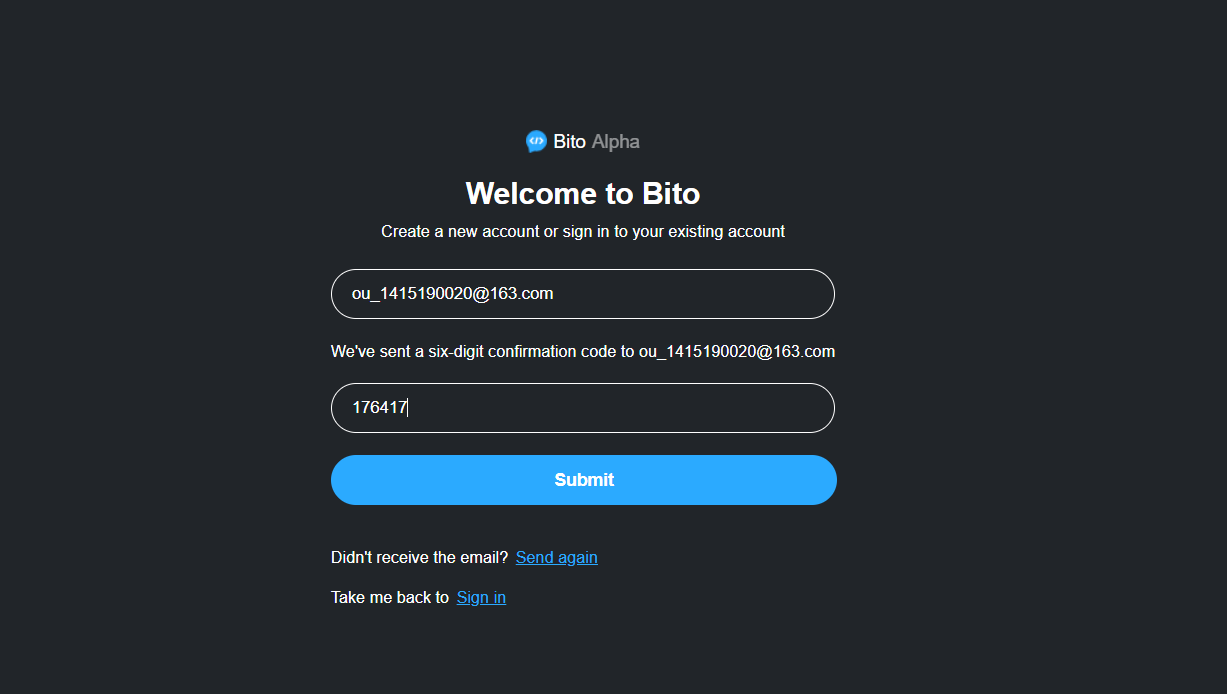 bito操作手册 ouyangyufeng 2024-01-03 开发工具 一:输入网站https://alpha.bito.co/bitoai/ 二:填写邮箱 三:登录邮箱,获取验证码 四:填写验证码 五:完成